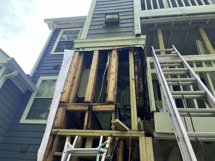 View of Extensive Structural Damage Caused by Bulk Water Intrusion at Exterior Wood-Framed Wall & Balcony Interface