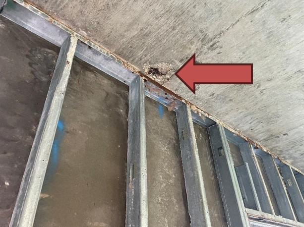 Interior View of Corroded Light-Gauge Framing & Concrete Slab Edge Spalling due to Persistent Water Leaks