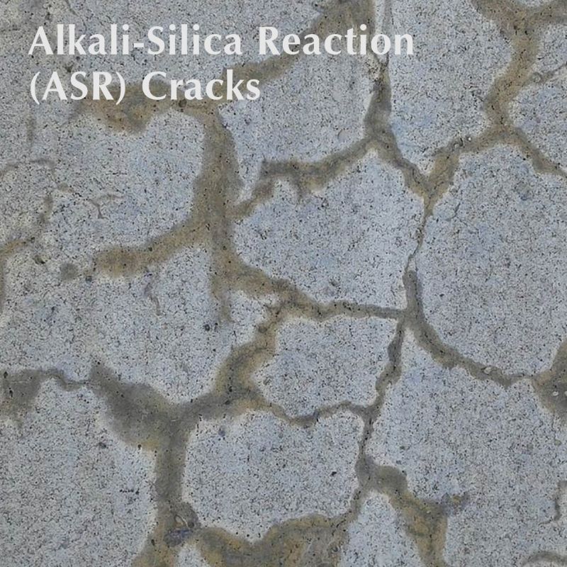 Cracking associated with alkali-silica reaction (ASR) and sulfate attack is driven by chemical expansion and sustained moisture availability. Typical attributes include random or map cracking, Y-shaped or non-structural crack layouts, and progressive internal distress.