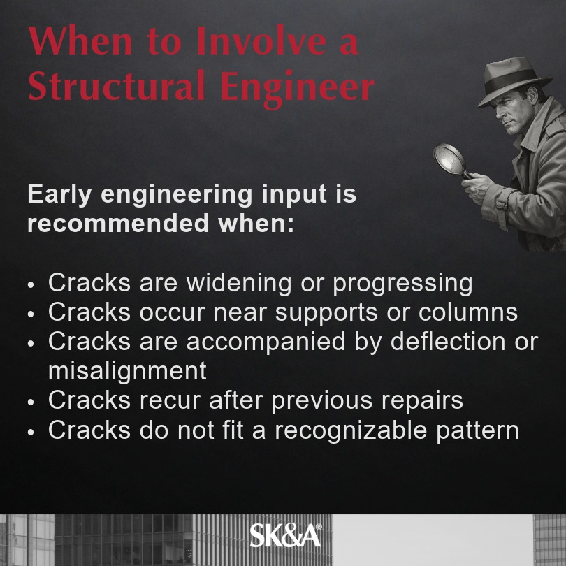 Early engineering input is recommended when cracks are widening or progressing, when cracks occur near supports or columns, when cracks are accompanied by deflection or misalignment, when cracks recur after previous repairs, or when cracks do not fit a recognizable pattern.