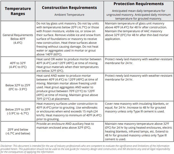 Under TMS 602 (Specification for Masonry Structures) and the International Building Code (IBC), cold weather provisions apply when ambient temperatures drop below 40°F (4.4°C).
