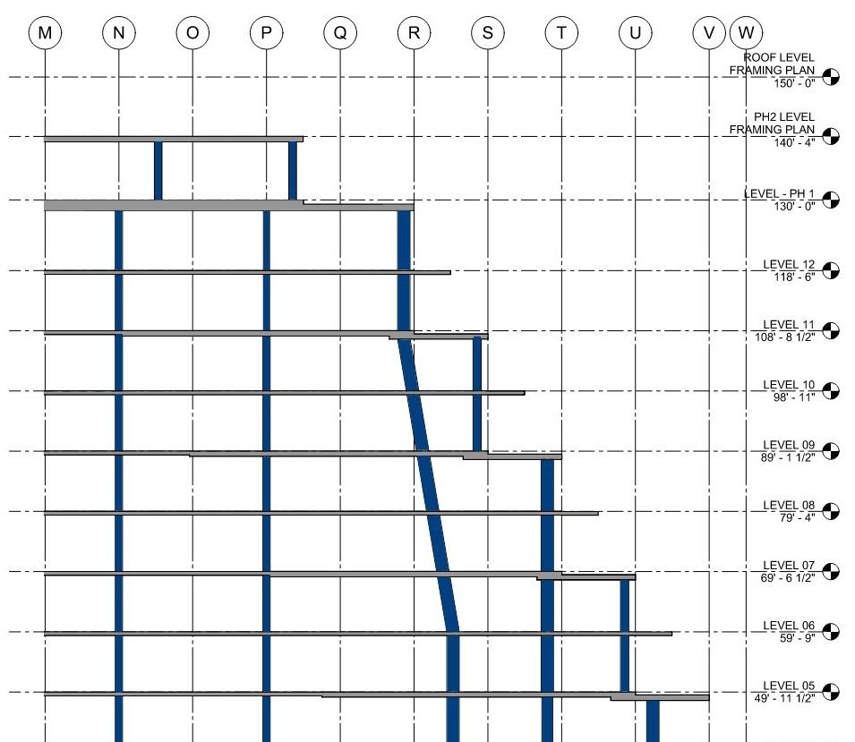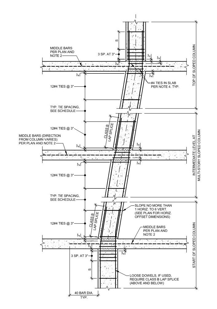 When upper and lower column grids don’t align, sloping columns offer a cleaner alternative to transfer beams, combining structural efficiency with design flexibility.